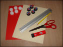 Matériel nécessaire : 2 feuilles de couleur au choix, 10 bouchons de bouteilles en plastique (2 couleurs différentes), latte, crayon, ciseaux et colleDécoupe un carré de 21 cm de côté et 8 rectangles de 21cm X 1cm .Colle les bandelettes sur le carré comme sur la photo ...